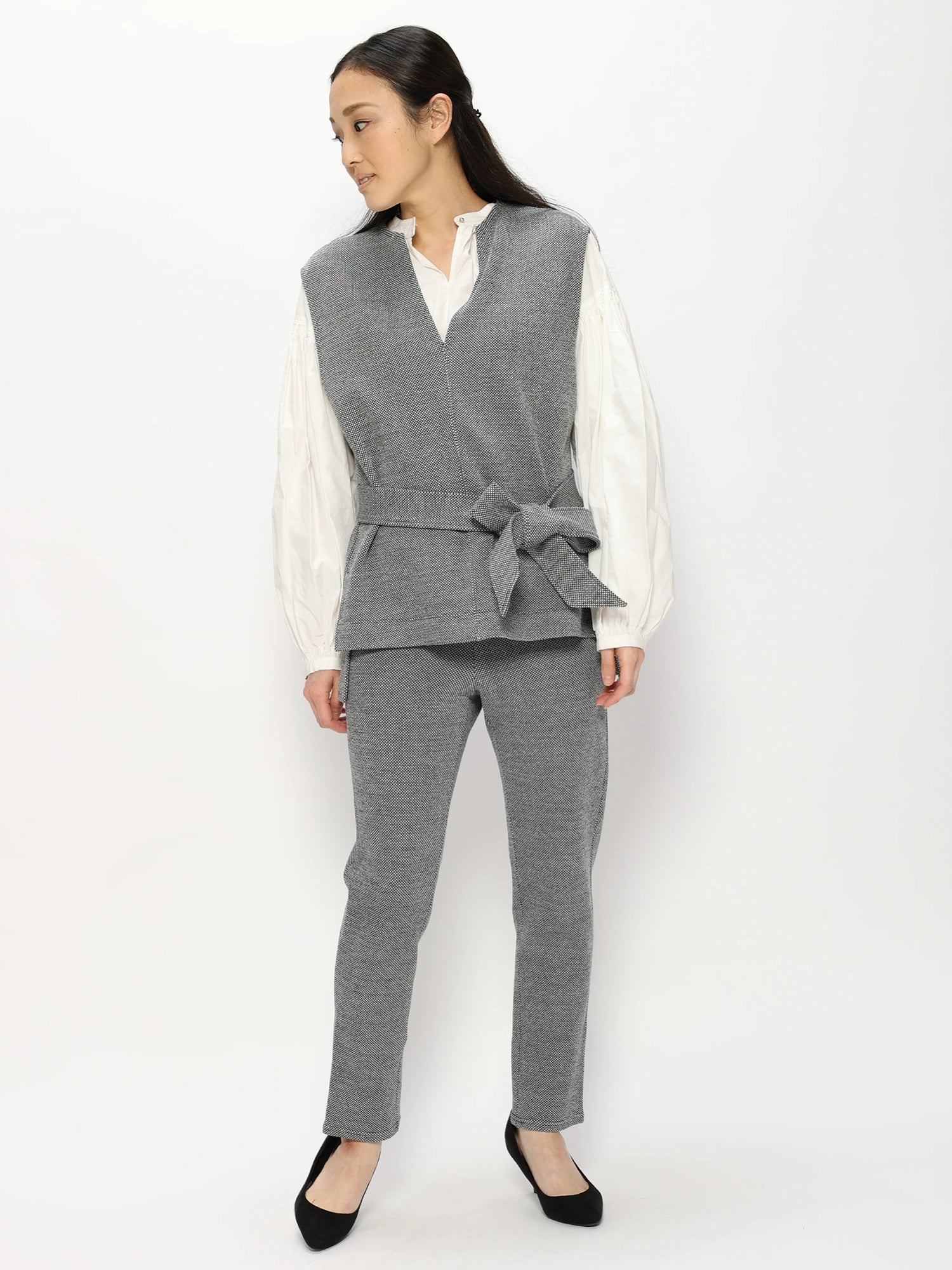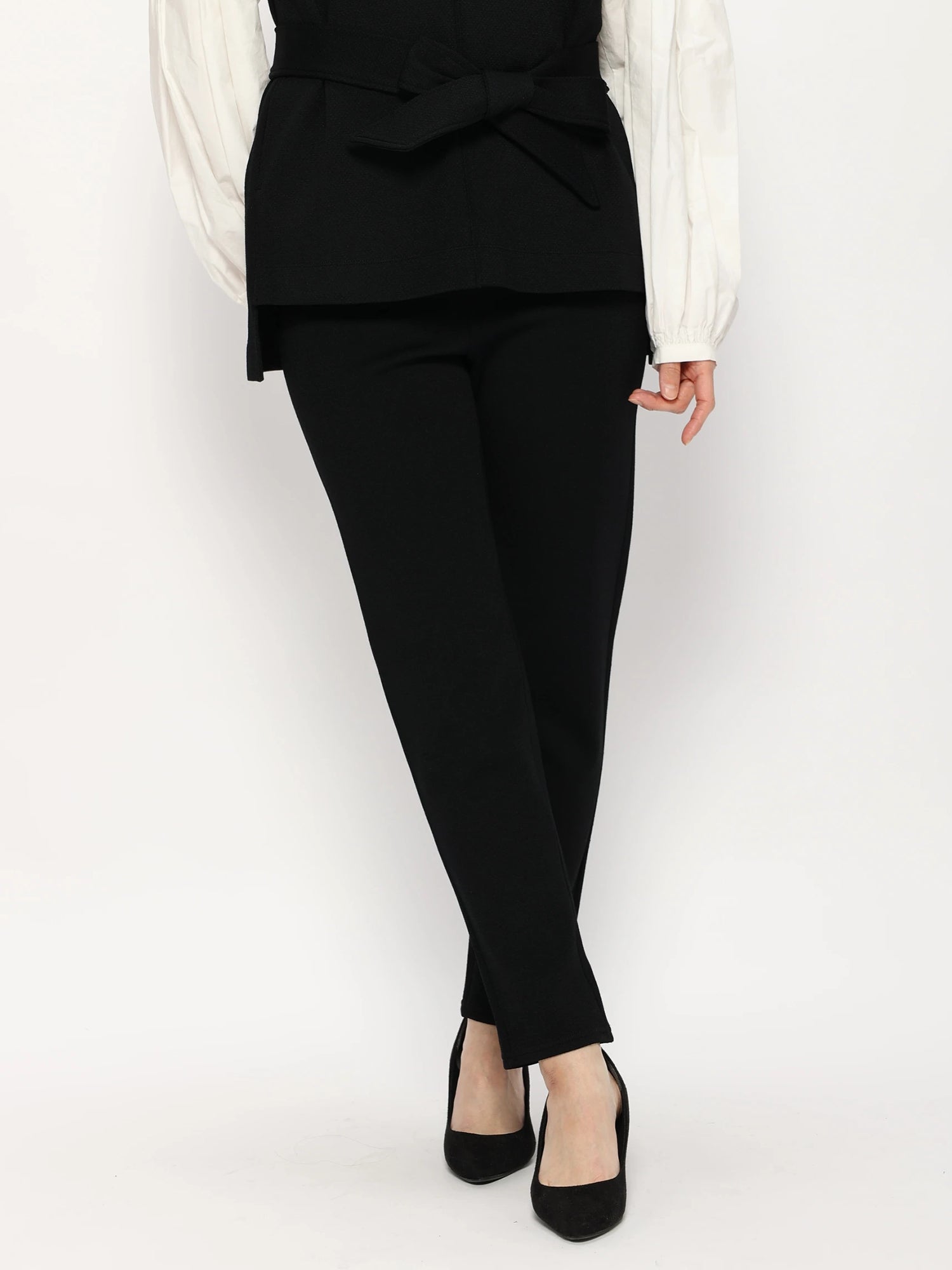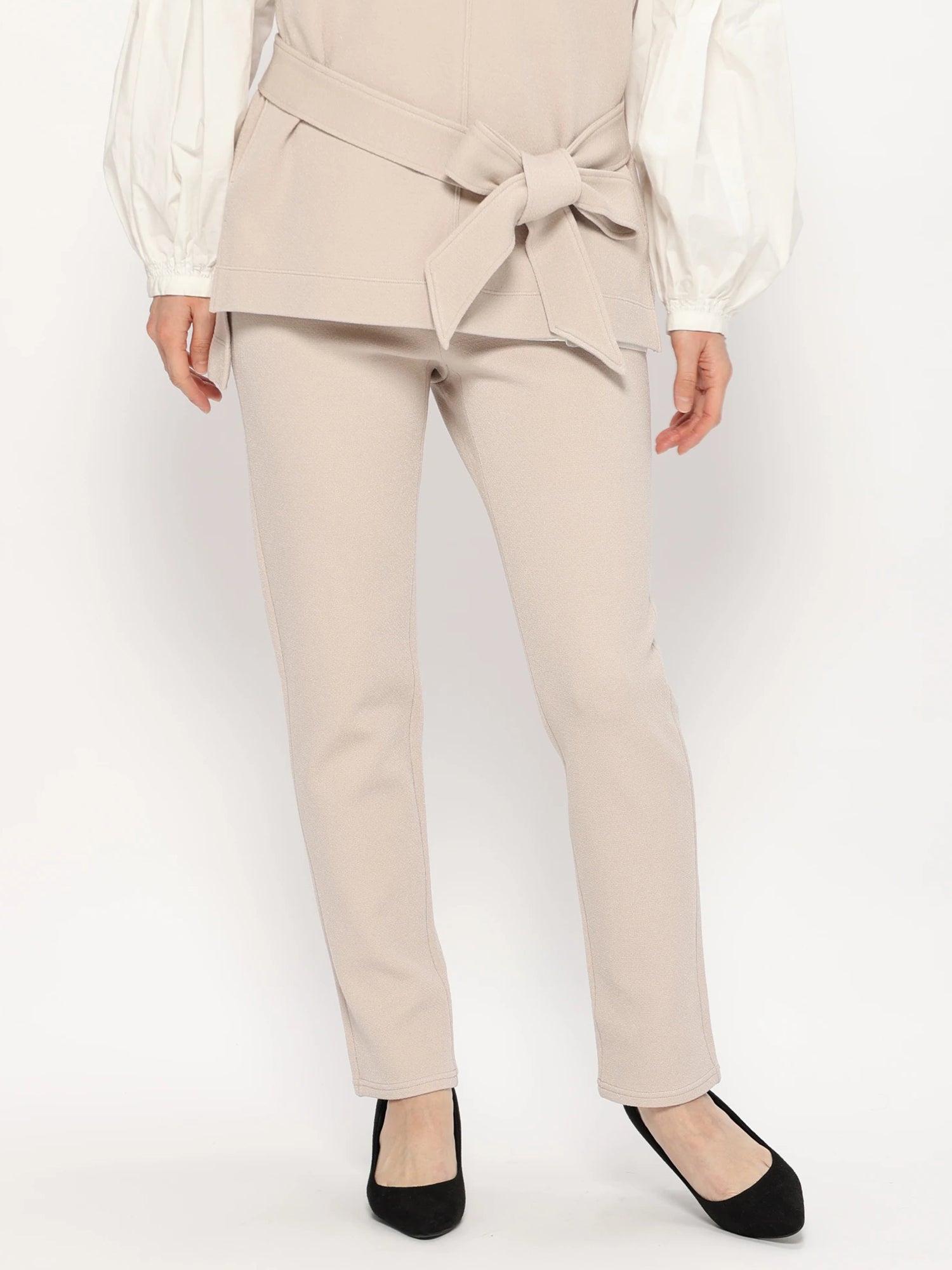 ウエストはゴムのイージータイプで履きやすくボディラインを拾わない肉感で少しゆるっとしたシルエットで裾にかけてテーパードになっているのでバランスがとりやすく様々なトップスやアウターとの相性がよく着回し力のあるアイテムです。