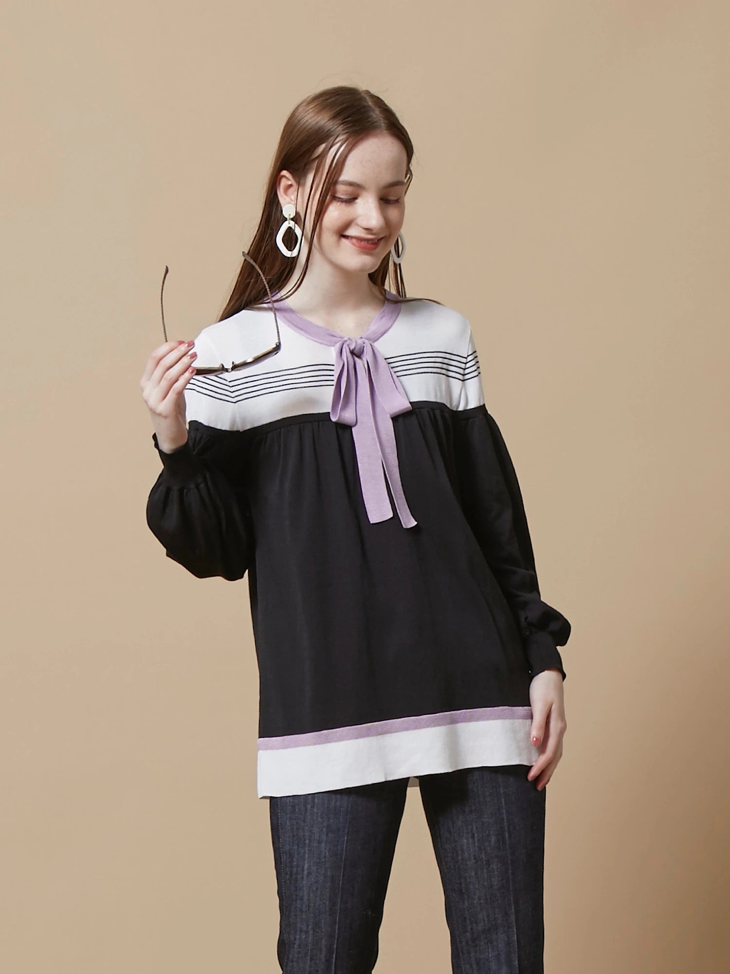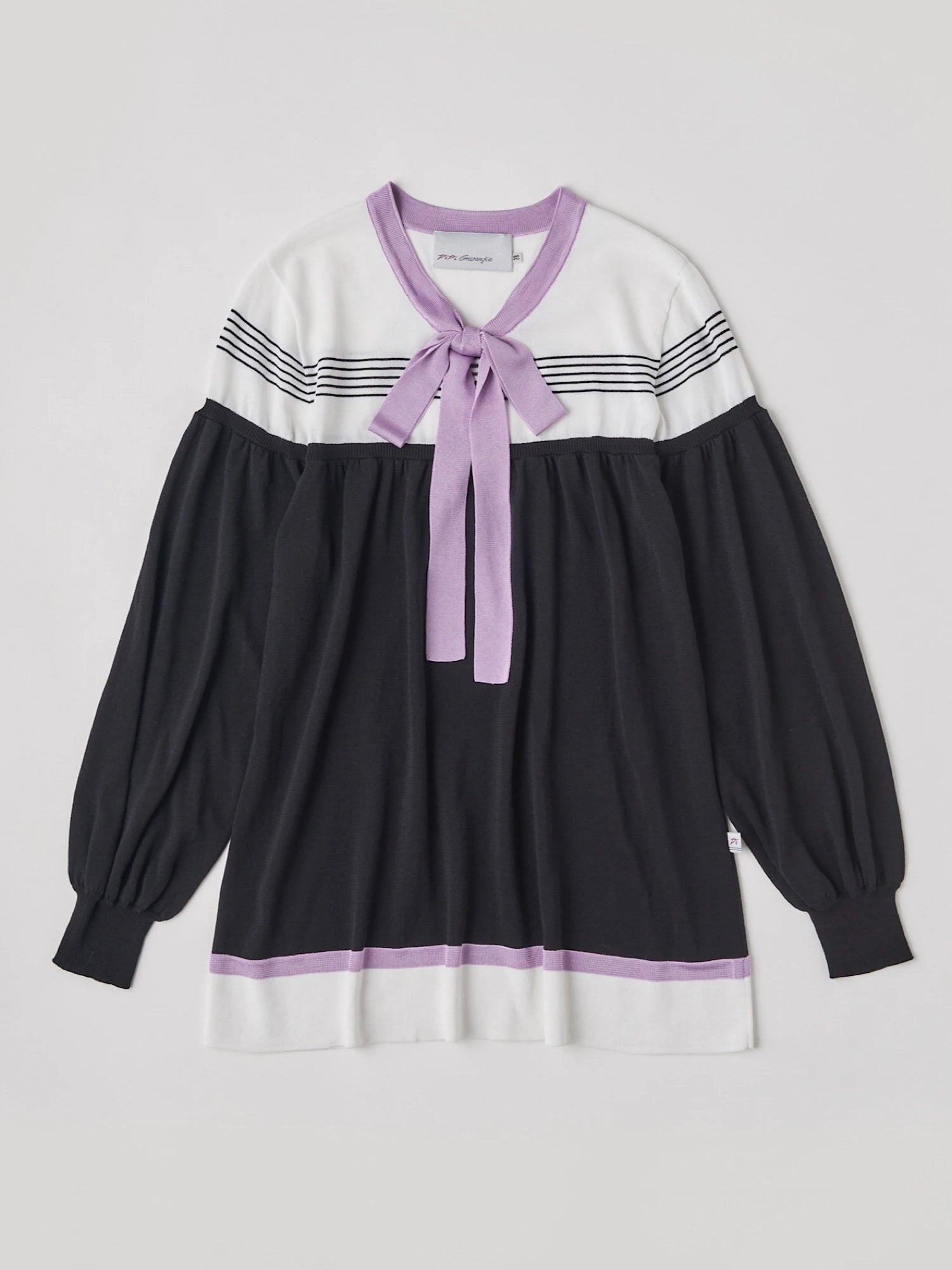 ボウタイ付きニット。上品なスタイリングが叶う一枚です。