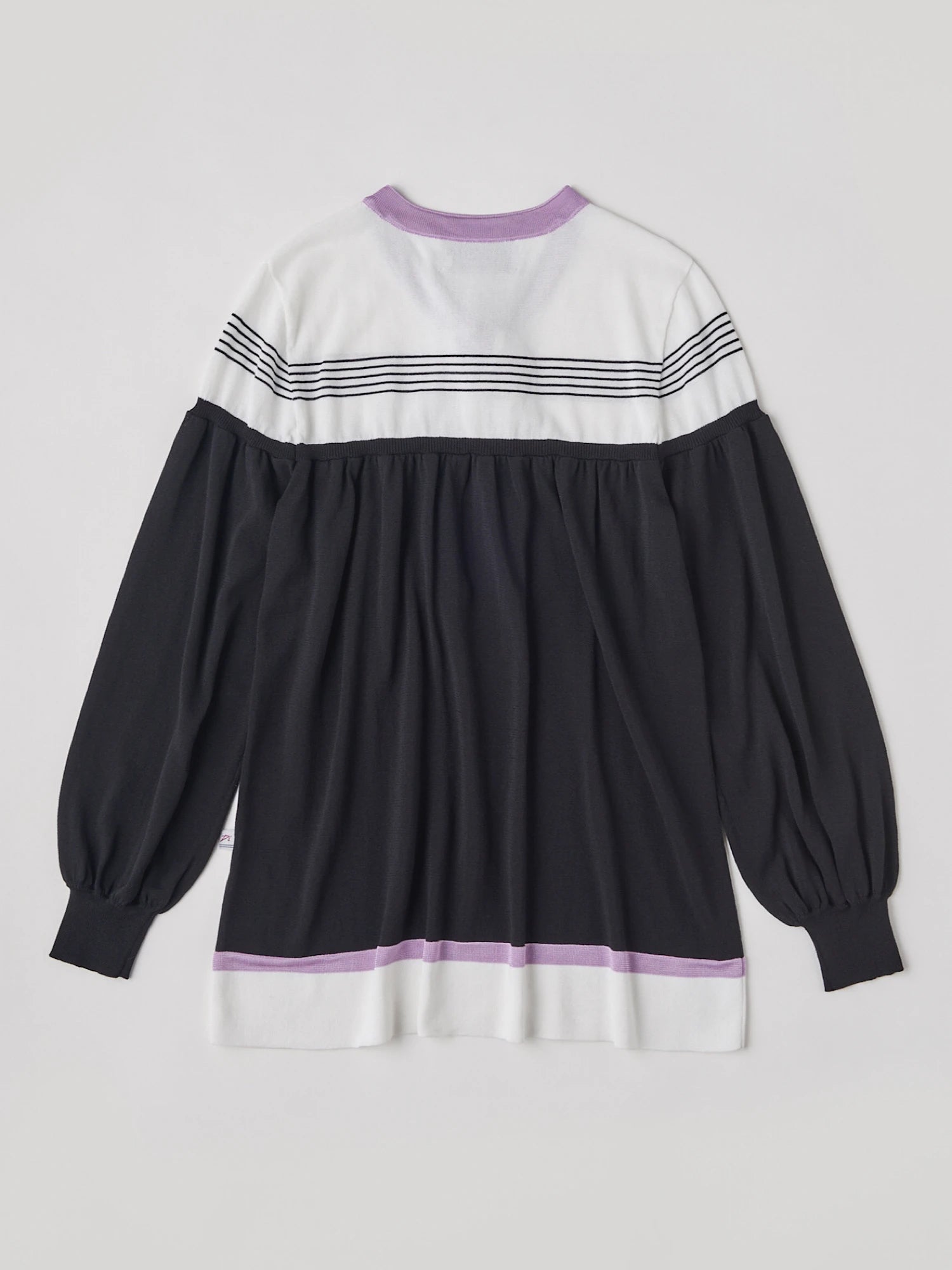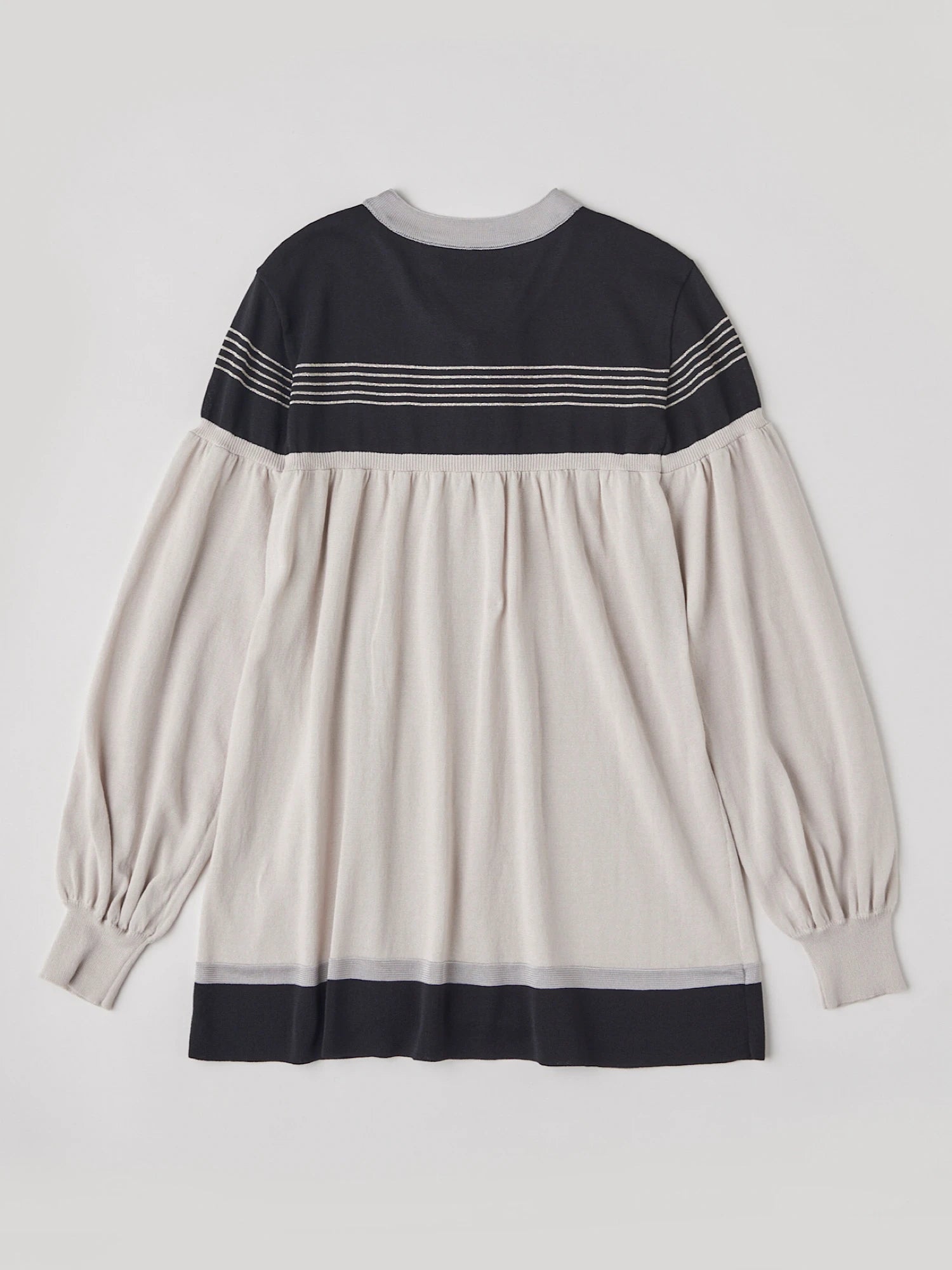 肌にも優しく軽いニットです。胸の下にはさりげなくギャザーを入れ、立体的にしました。袖に程よいボリュームを持たせ、ふわっとしたブラウスのようなニットです。細いボーダーもポイント。同色のラメも入っています。