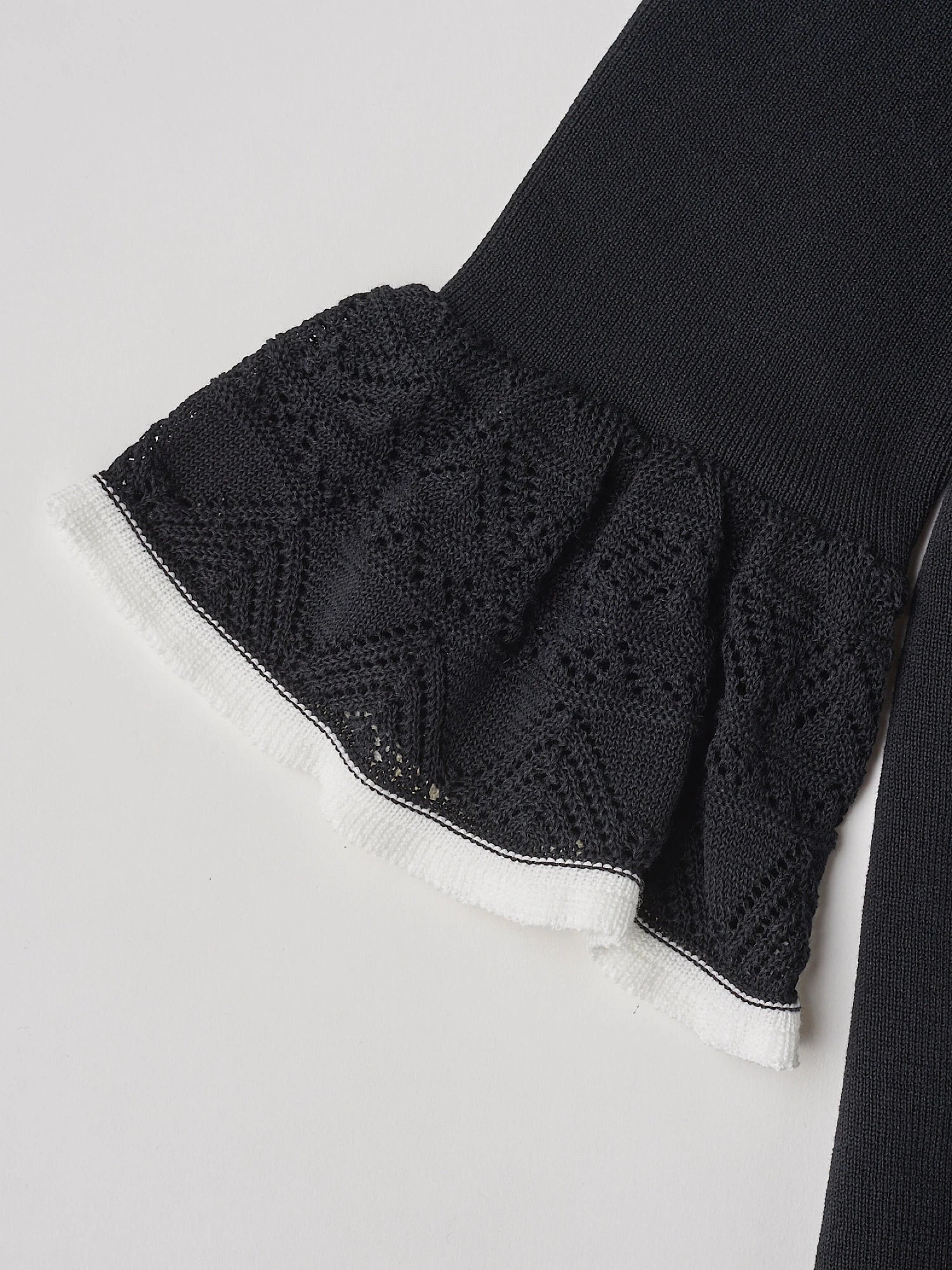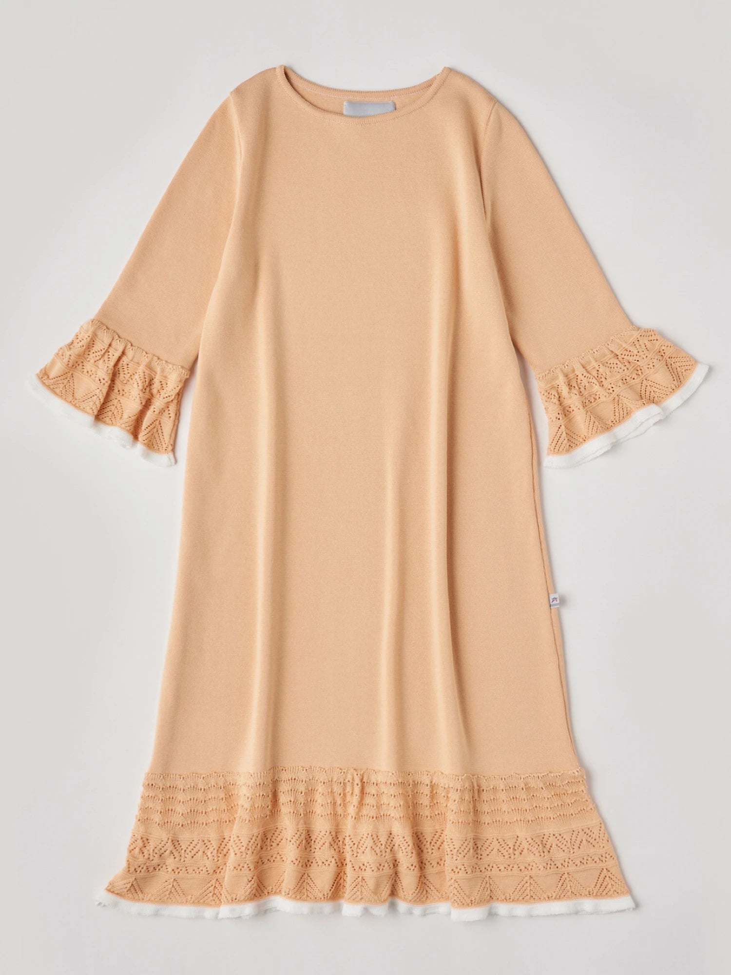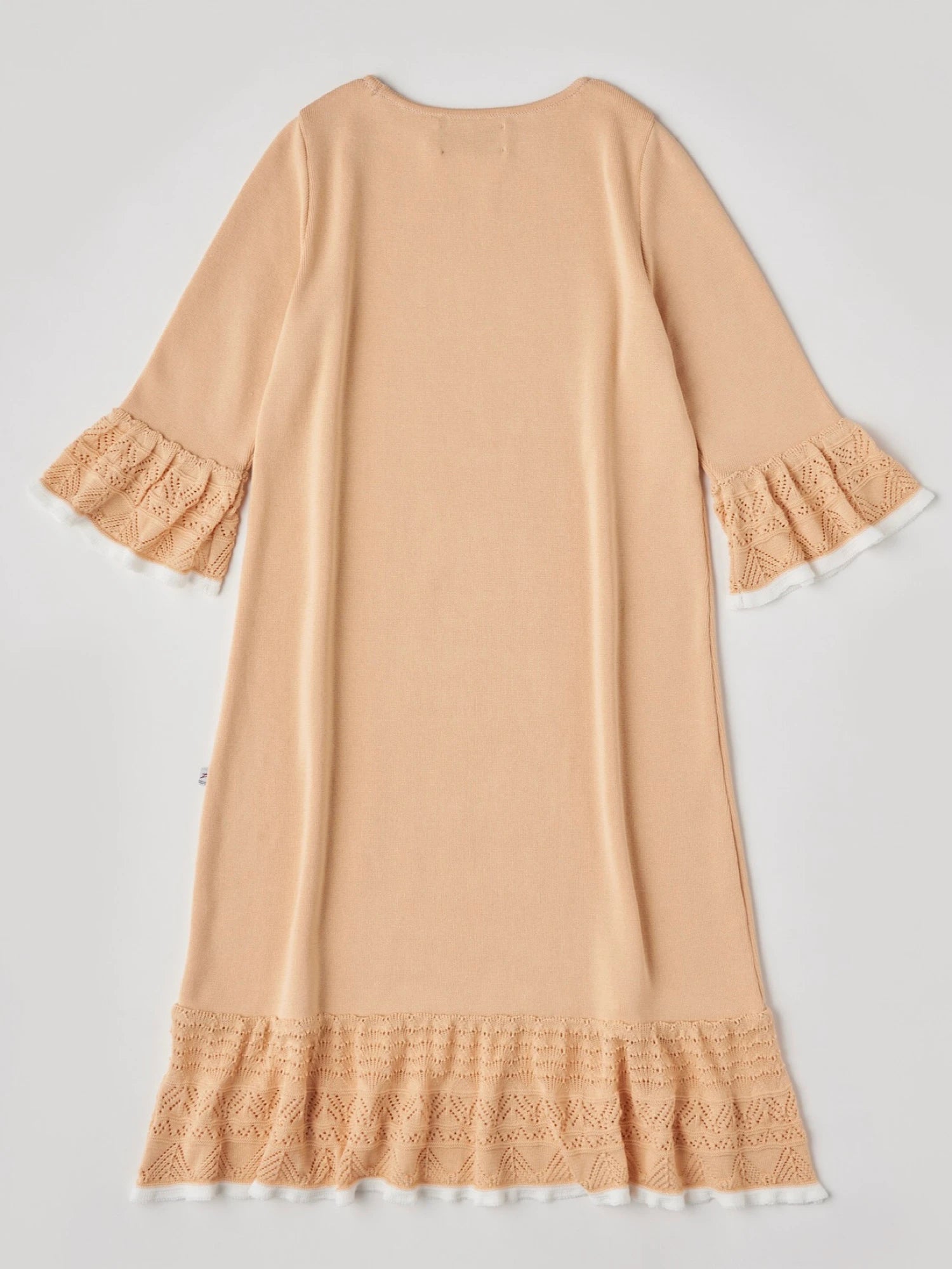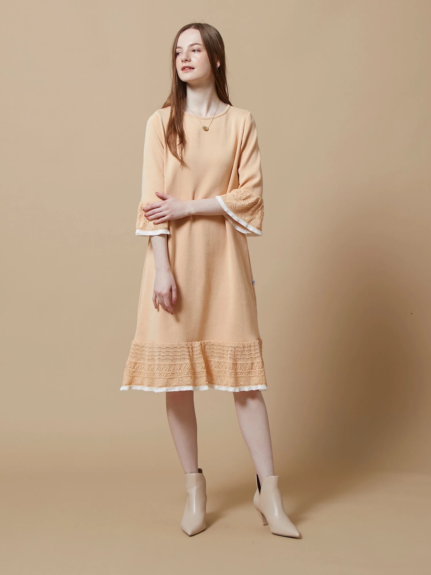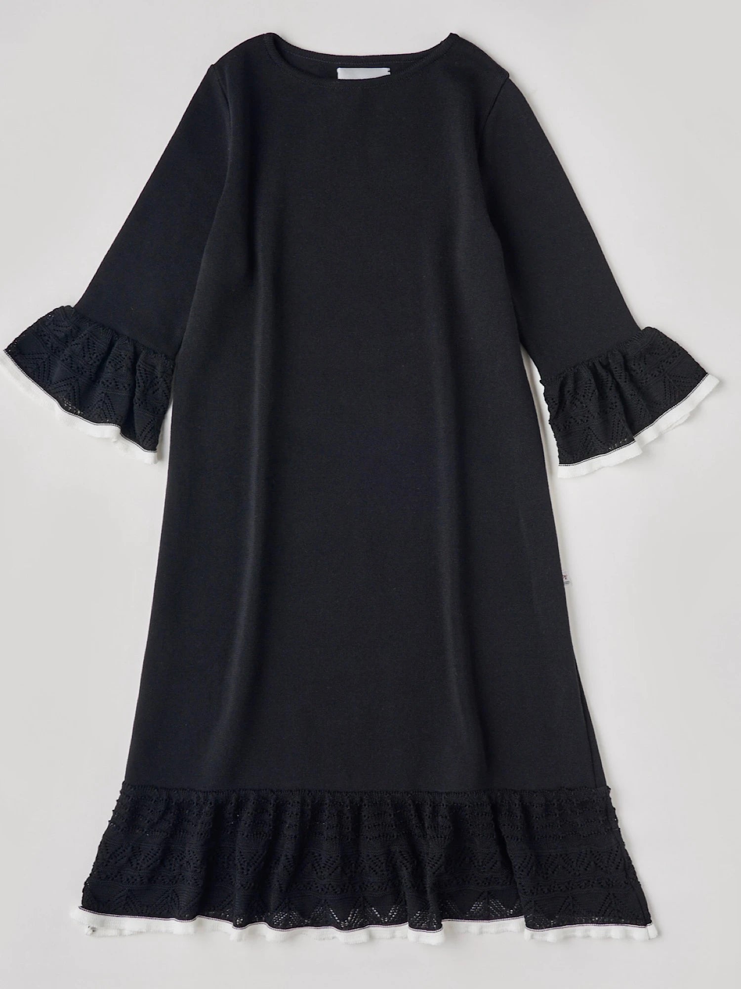 適度な厚みがあり、体のラインを拾わないシルエット。夏でも涼しく着用できます。女性らしいシルエットの、Aラインワンピース。裾と袖口のみ、レーシー編みにしたシンプルデザイン。着る人を選ばないワンピースです。