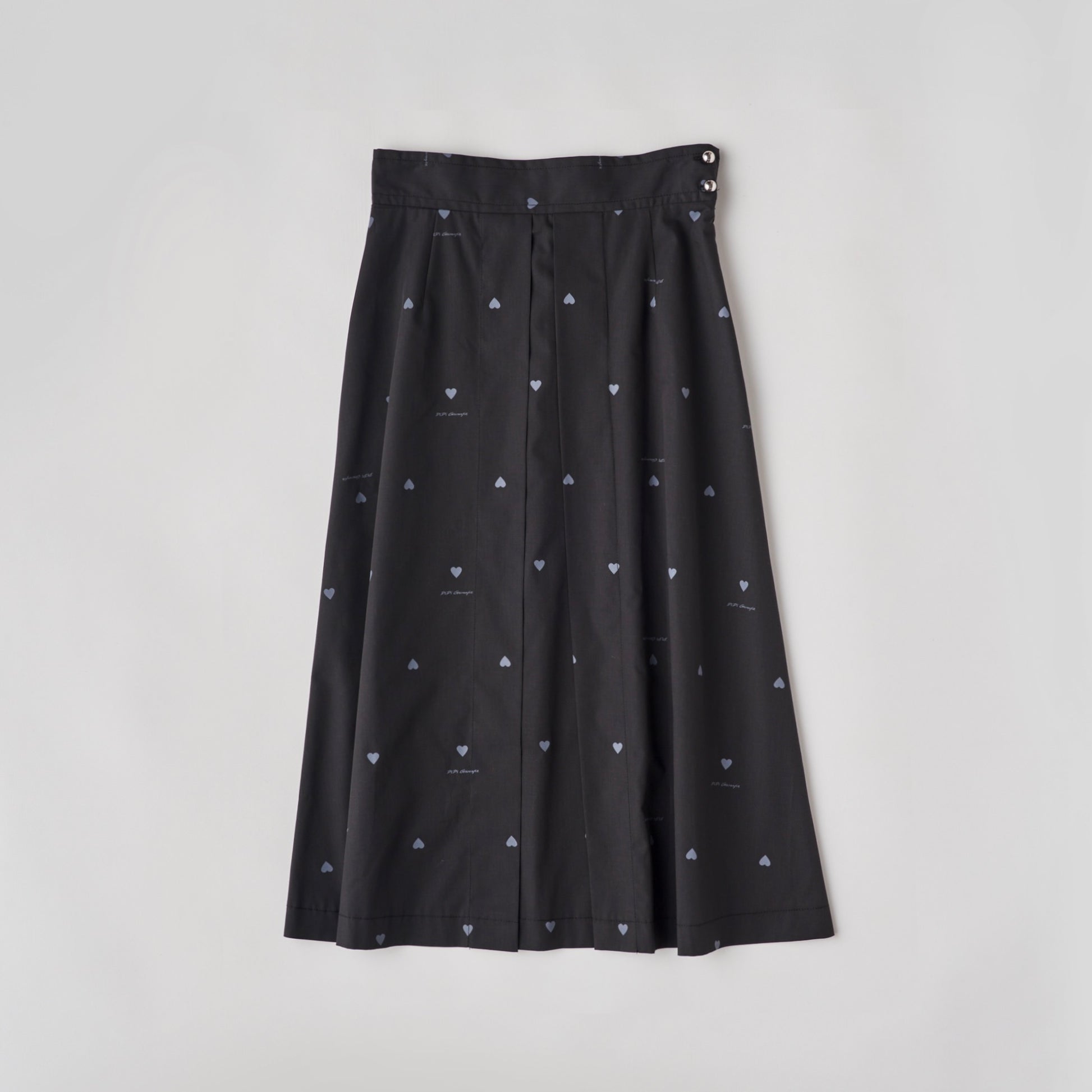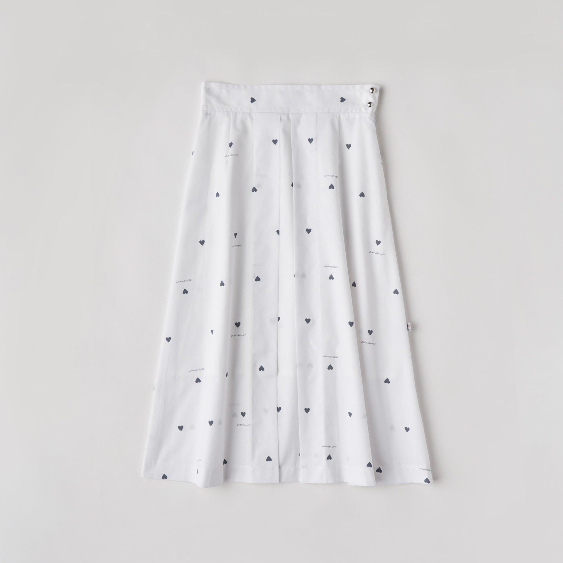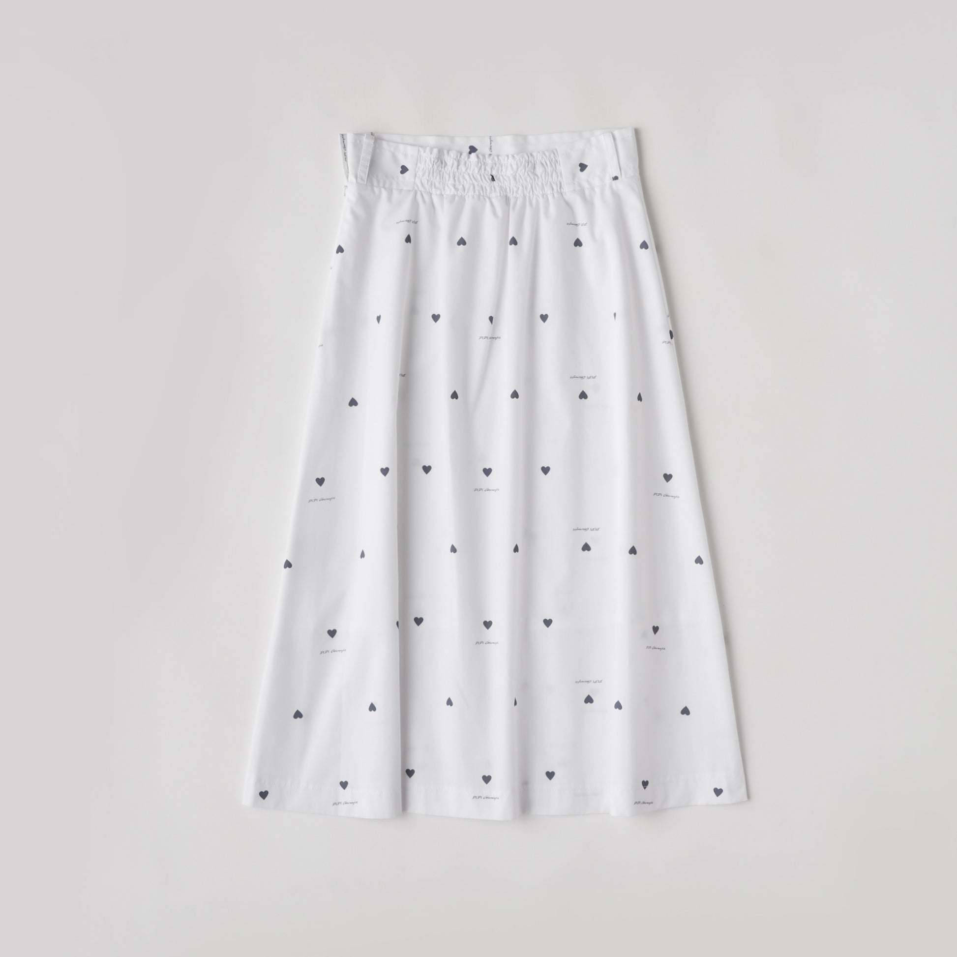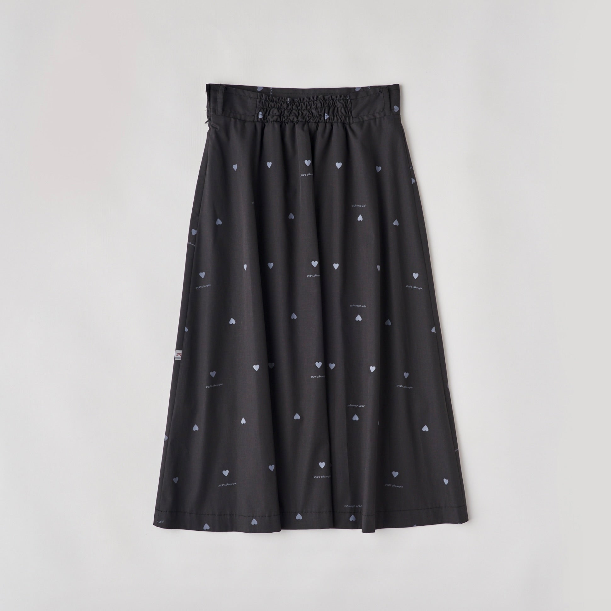 このAラインスカートは、程よいハリ感があるコットンブレンド素材を使用し、ホワイトベースにダークグレー(ブラックベースもダークグレー)のハートとロゴをプリントしたオリジナル生地を採用しています。