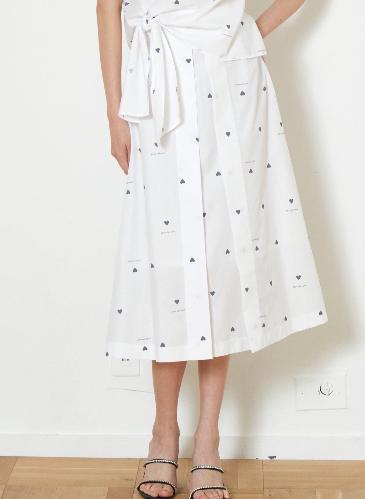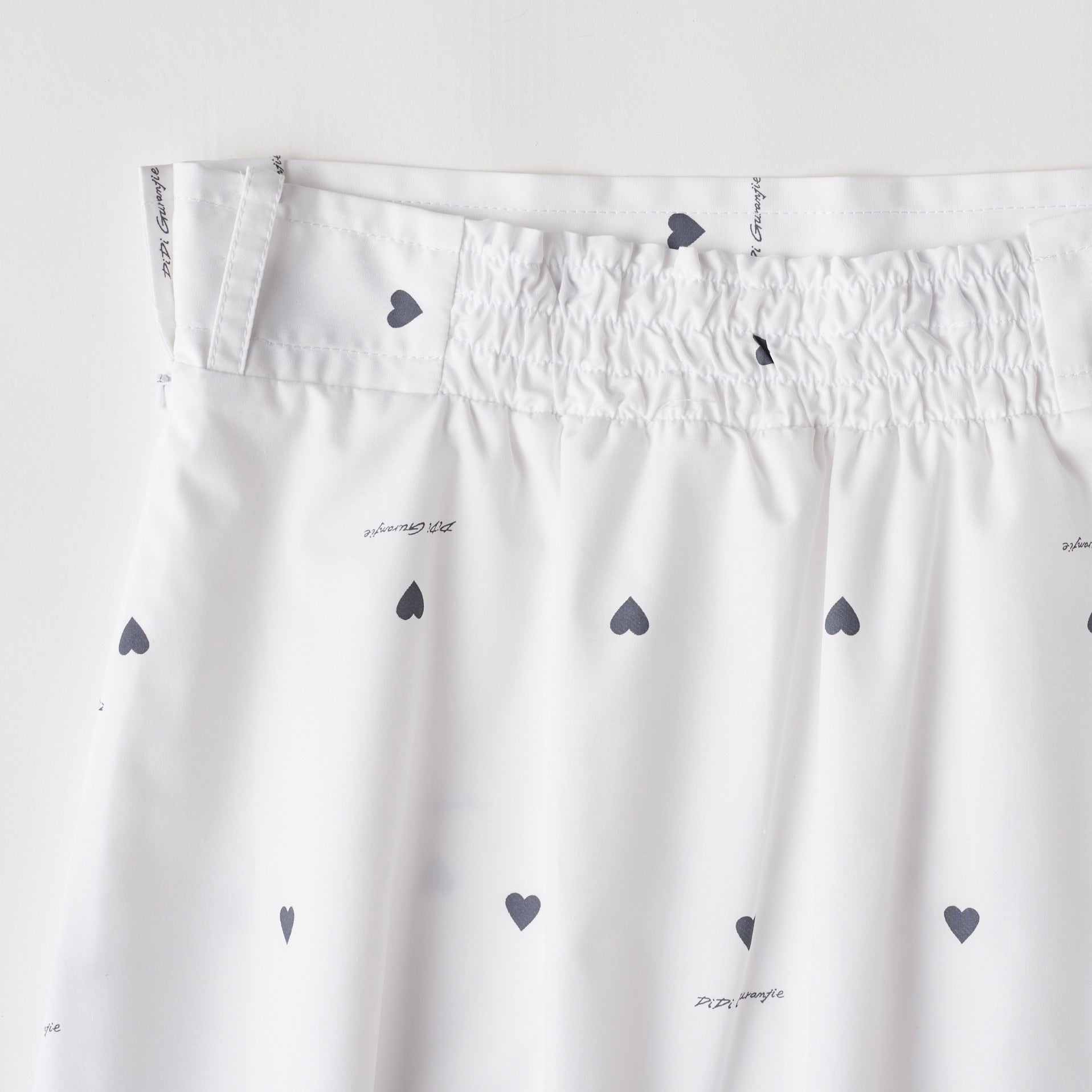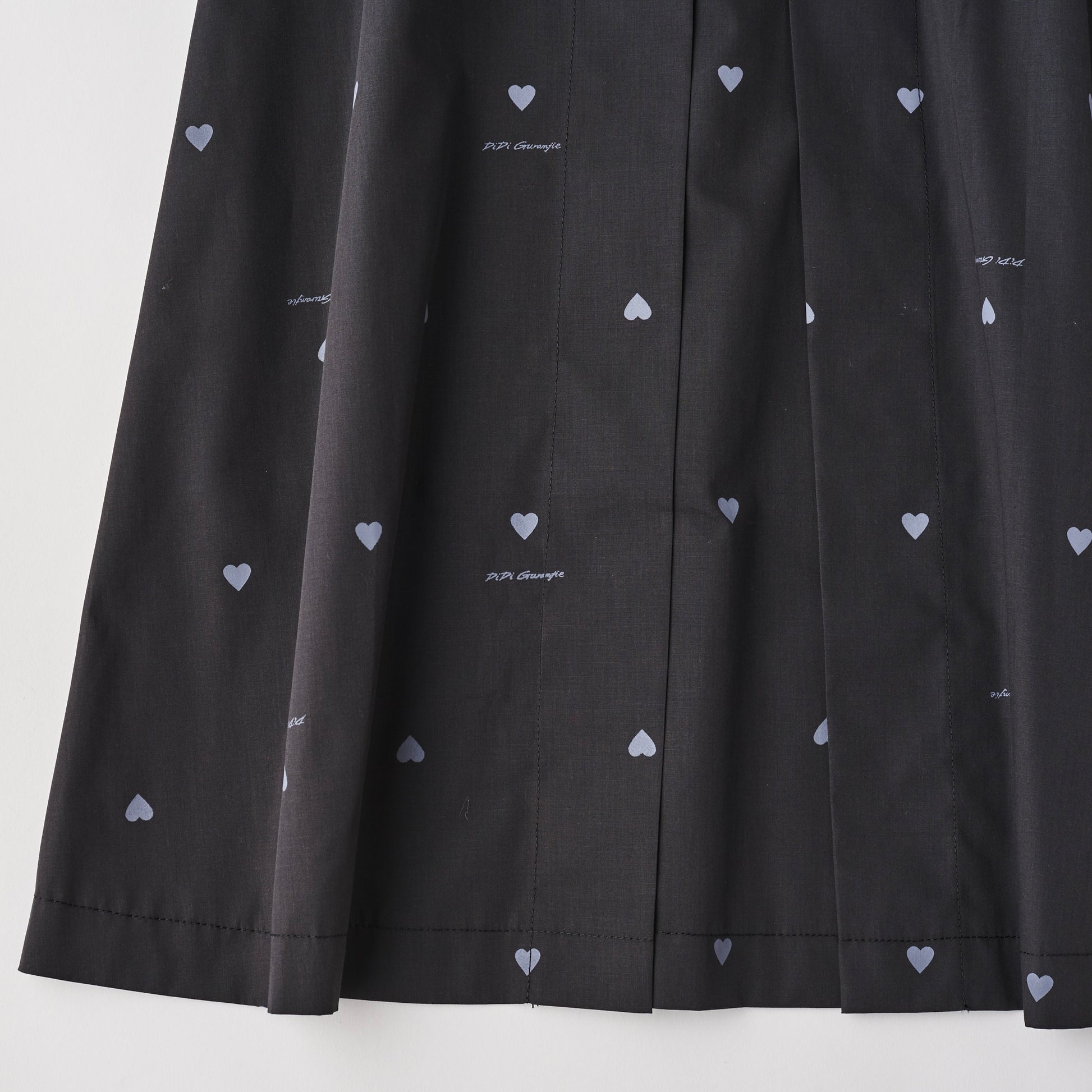 このAラインスカートは、程よいハリ感があるコットンブレンド素材を使用し、ホワイトベースにダークグレー(ブラックベースもダークグレー)のハートとロゴをプリントしたオリジナル生地を採用しています。