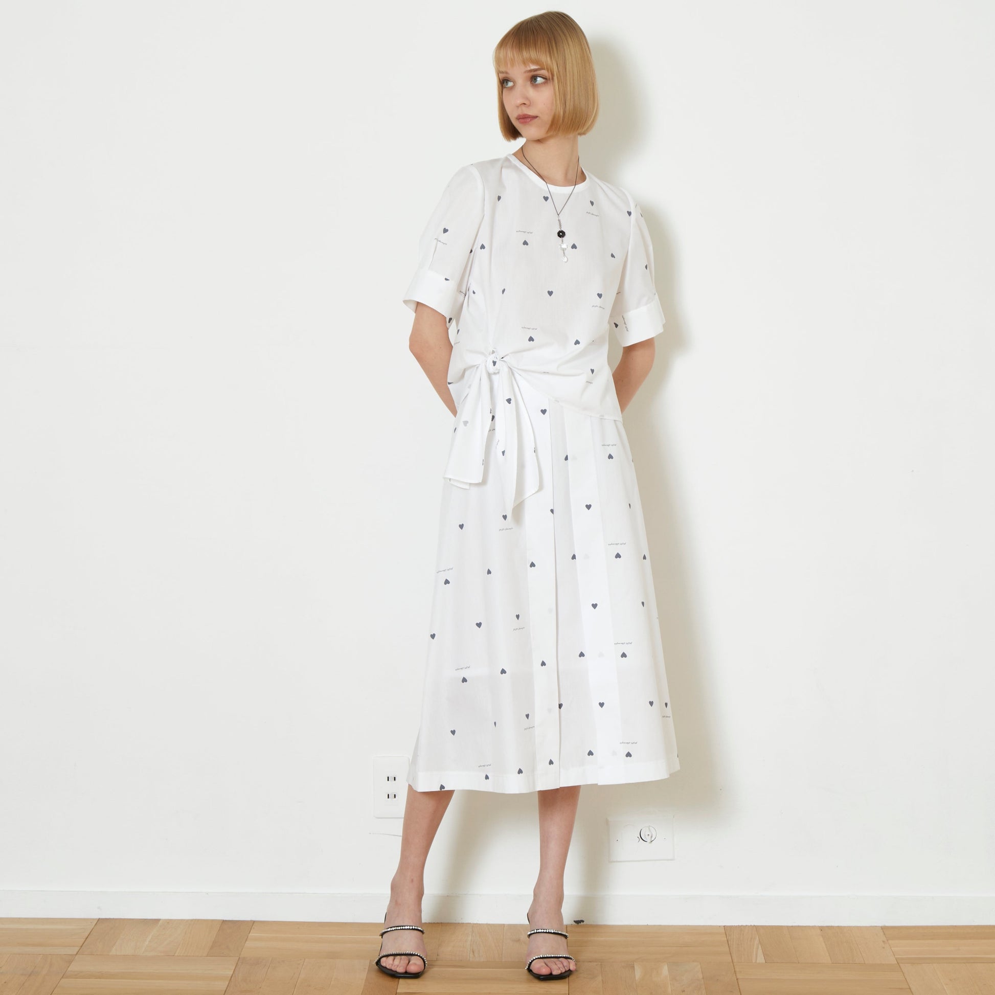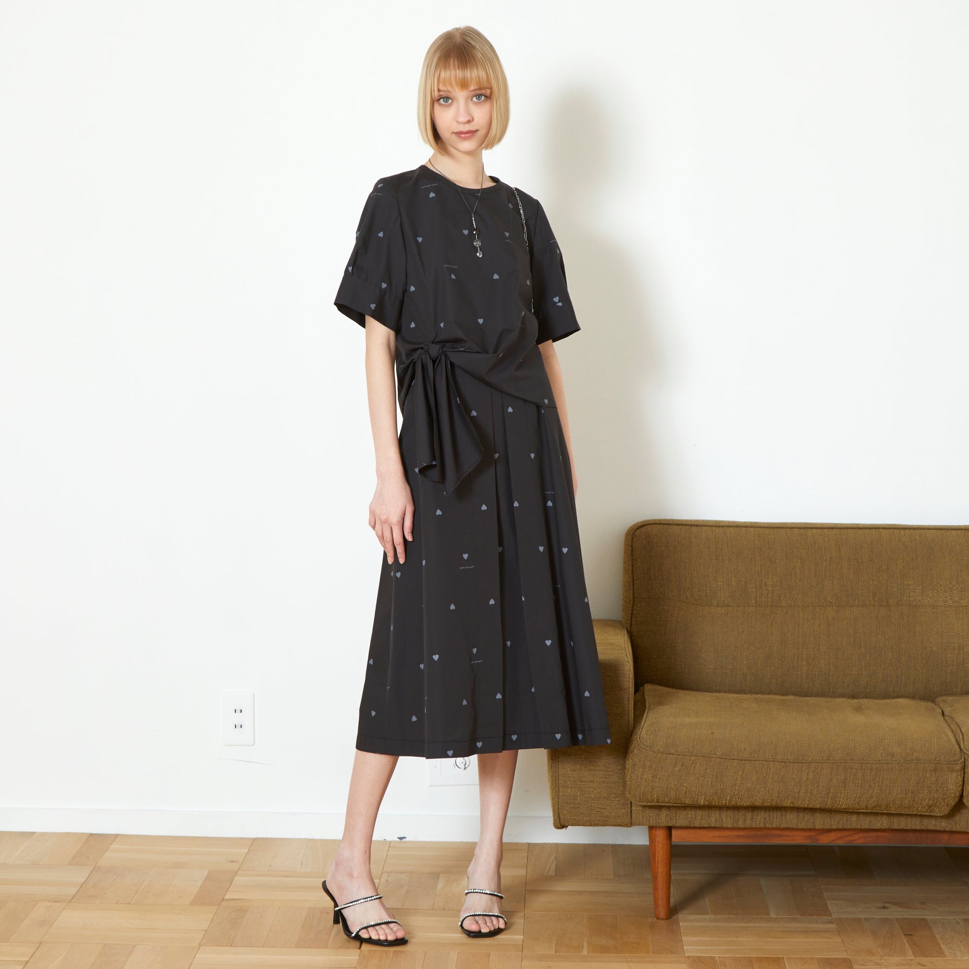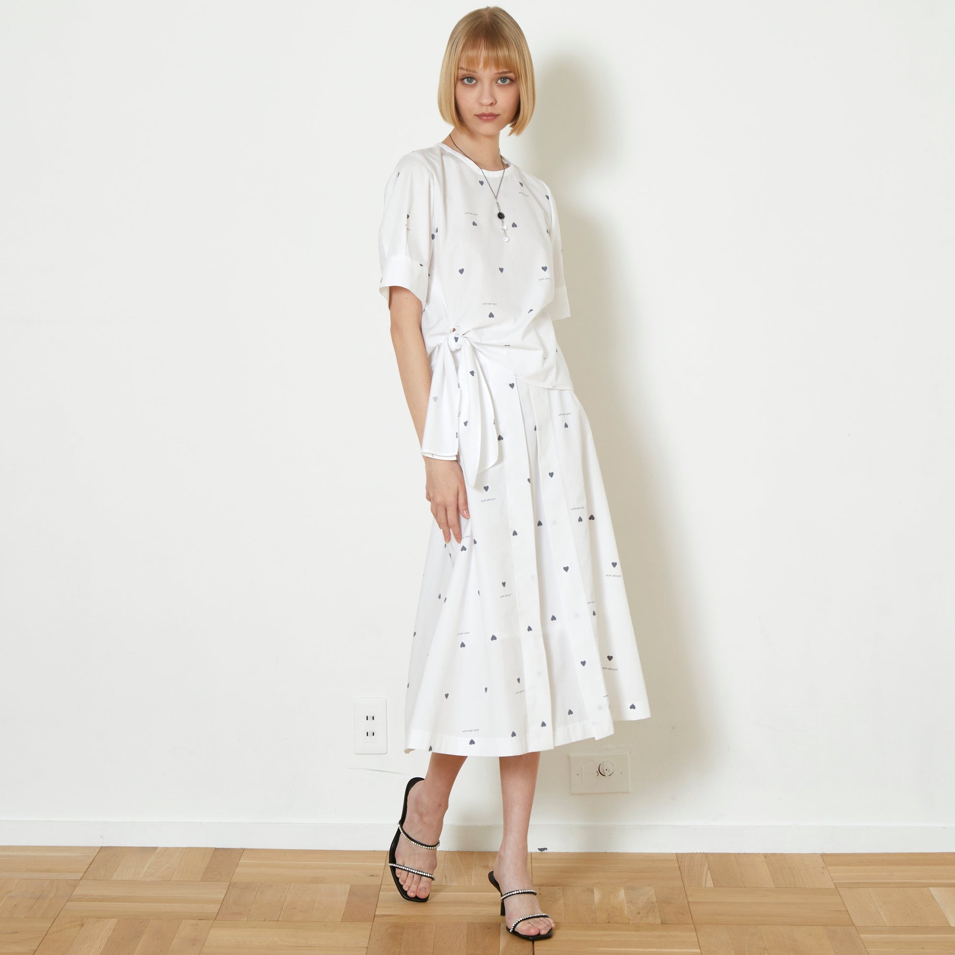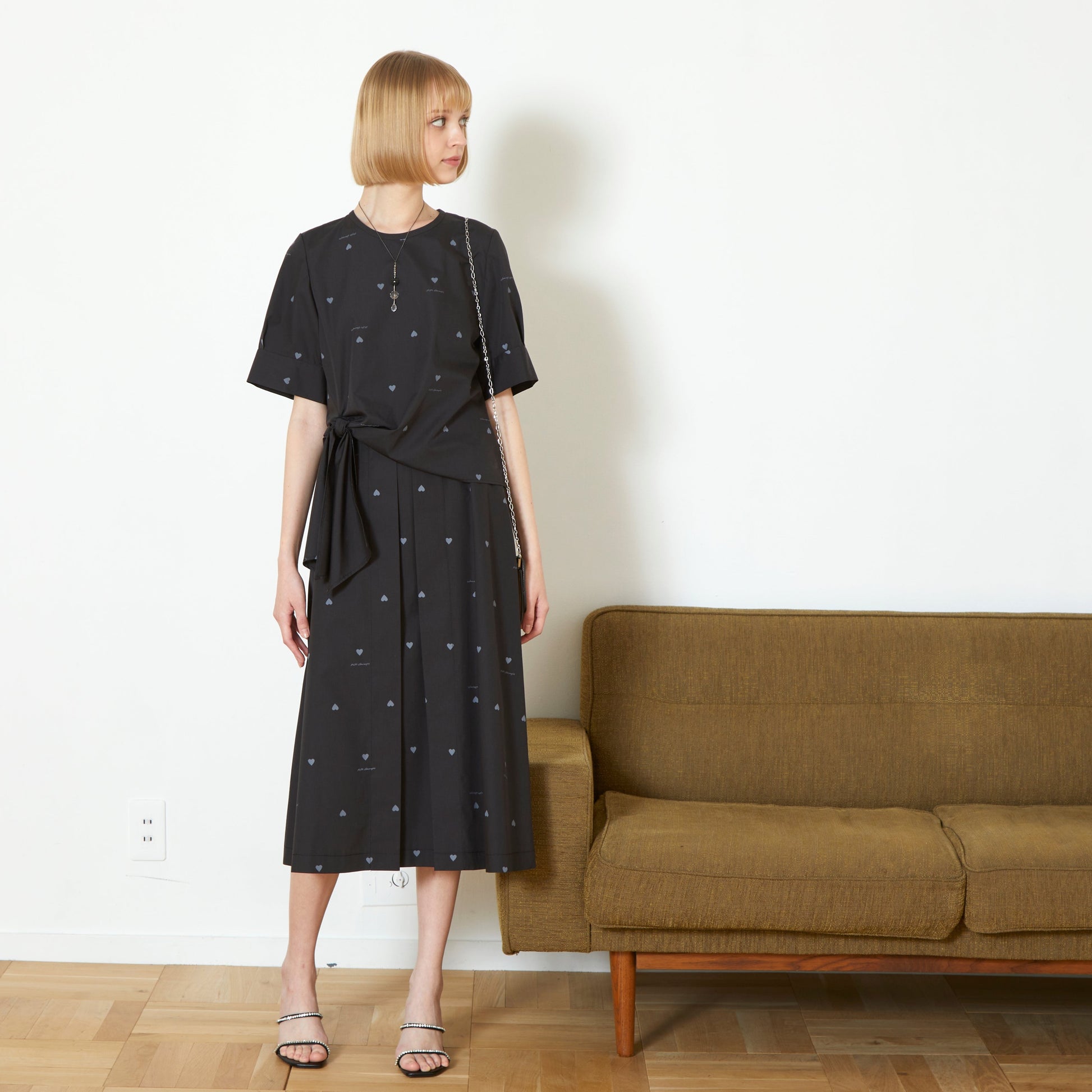 このAラインスカートは、程よいハリ感があるコットンブレンド素材を使用し、ホワイトベースにダークグレー(ブラックベースもダークグレー)のハートとロゴをプリントしたオリジナル生地を採用しています。